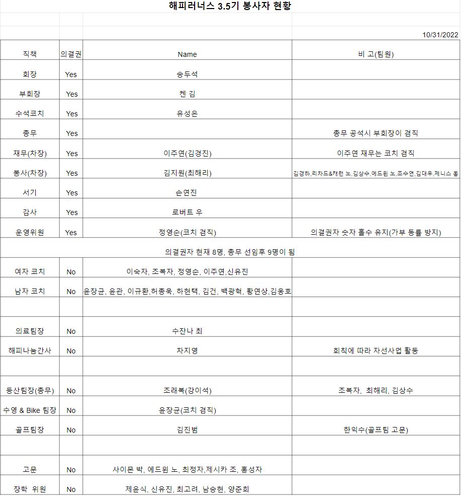 제목해피러너스 3.5기 봉사자 현황2022-10-31 16:17작성자Happy Admin첨부파일해피 3.5기 운영진.xlsx (6.4KB) 목록 이전2023년 1월 8일 운영위원회 회의록Happy Admin2023-01-09다음2022년 10월 16일 운영위원회 회의록Happy Admin2022-10-31 Powered by MangBoard