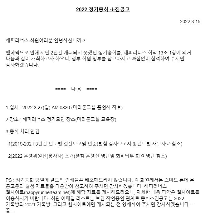 제목2022년 정기총회 소집공고2022-10-31 16:19작성자Happy Admin첨부파일2022 정기총회 소집공고.docx (7.1KB) 목록 이전2023년도 정기총회 소집공고Happy Admin2023-02-10다음Happy Runners 개정회칙(정관)_2022년 6월 26일자 기준[Happy1] Happy2022-07-13 Powered by MangBoard