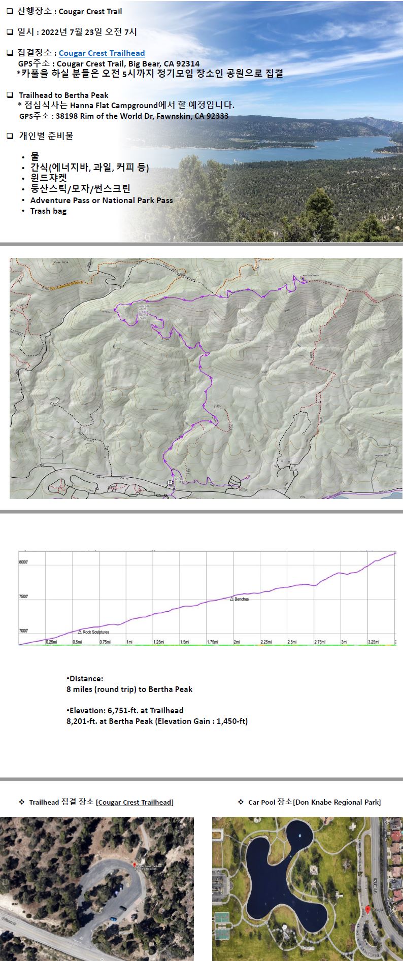 글보기2022년 7월 정기산행 안내 [Cougar Crest Trail] Lee Khang조회수227 2022-07-06 16:31 안녕하세요, 아래와 같이 7월 정기산행 일정을 알려드리오니, 관심있으신 회원 여러분들의 많은 참여바랍니다. 1.일시: 7월 23일 토요일 오전 7시에 "Cougar Crest Trailhead" 모여서 산행 시작. *카풀을 하실 분들께서는 오전 5시 까지 정기모임 장소인 공원으로 모여주시기 바랍니다.2."산행 참여를 원하시는 회원분들께서는 참석인원에 대한 사전 파악을 위해 조복자 코치님에게 개인카톡으로 연락주시기 바랍니다."기타 궁금하신 내용은 등산팀(조래복, 조복자, 김상수, 최해리, 강이석)에 문의해 주시기 바랍니다. 목록 댓글 [0] 더보기이전2022년 8월 정기산행 안내 [Point Dume State Beach]강이석2022-08-17다음2022년 6월 정기산행 안내Lee Khang2022-06-09 Powered by MangBoard
